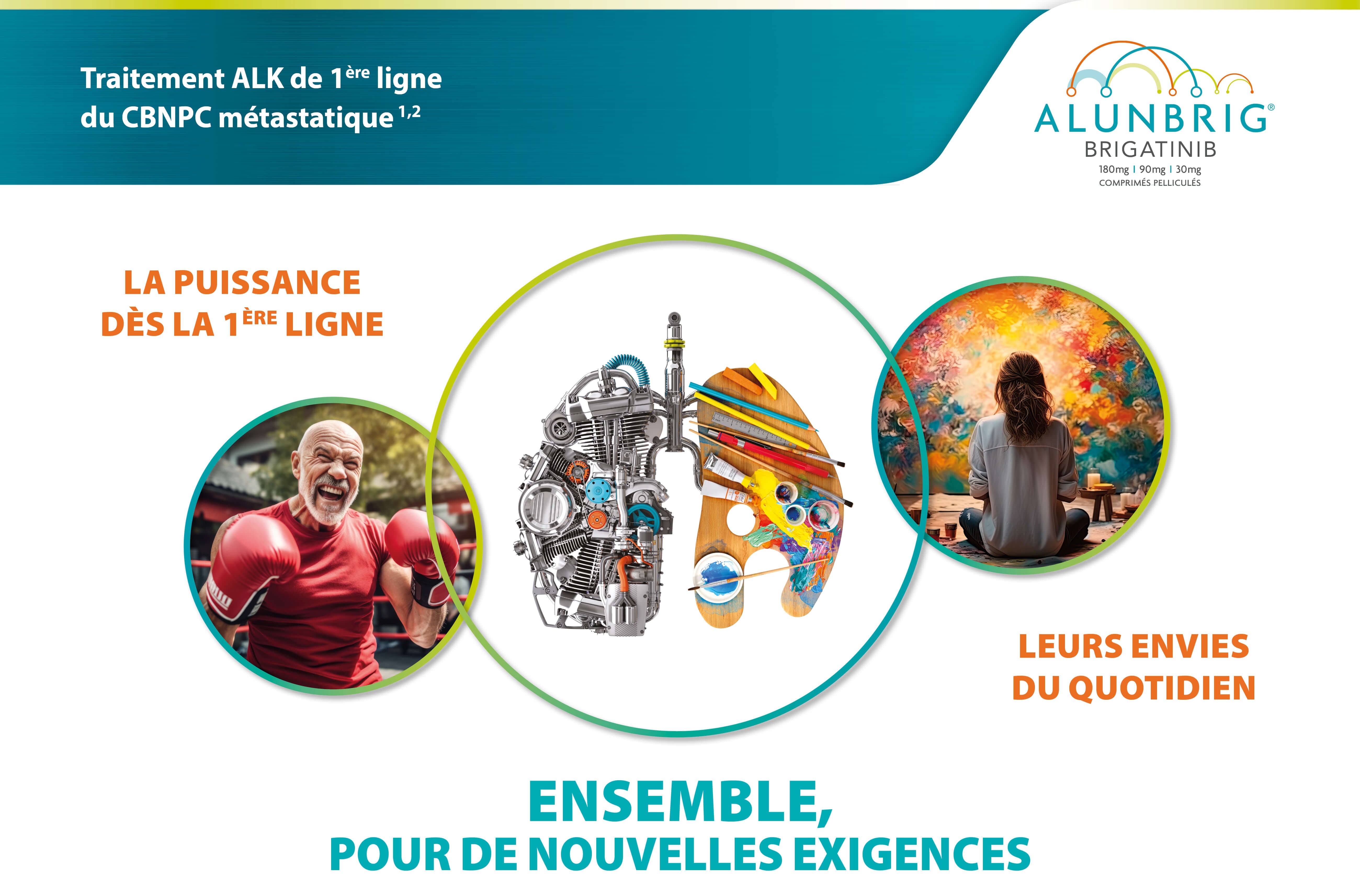Indications : ALUNBRIG® est indiqué en monothérapie pour le traitement des patients adultes atteints d’un cancer bronchique non à petites cellules (CBNPC) avancé présentant un réarrangement du gène ALK (ALK+) non précédemment traités par un inhibiteur de tyrosine kinase ciblant la mutation ALK+. 1,2 ALUNBRIG® est indiqué en monothérapie pour le traitement des patients adultes atteints de CBNPC avancé ALK+ et prétraités par crizotinib. 1