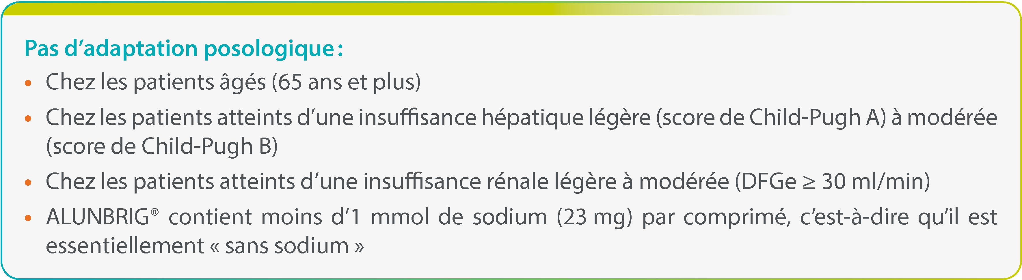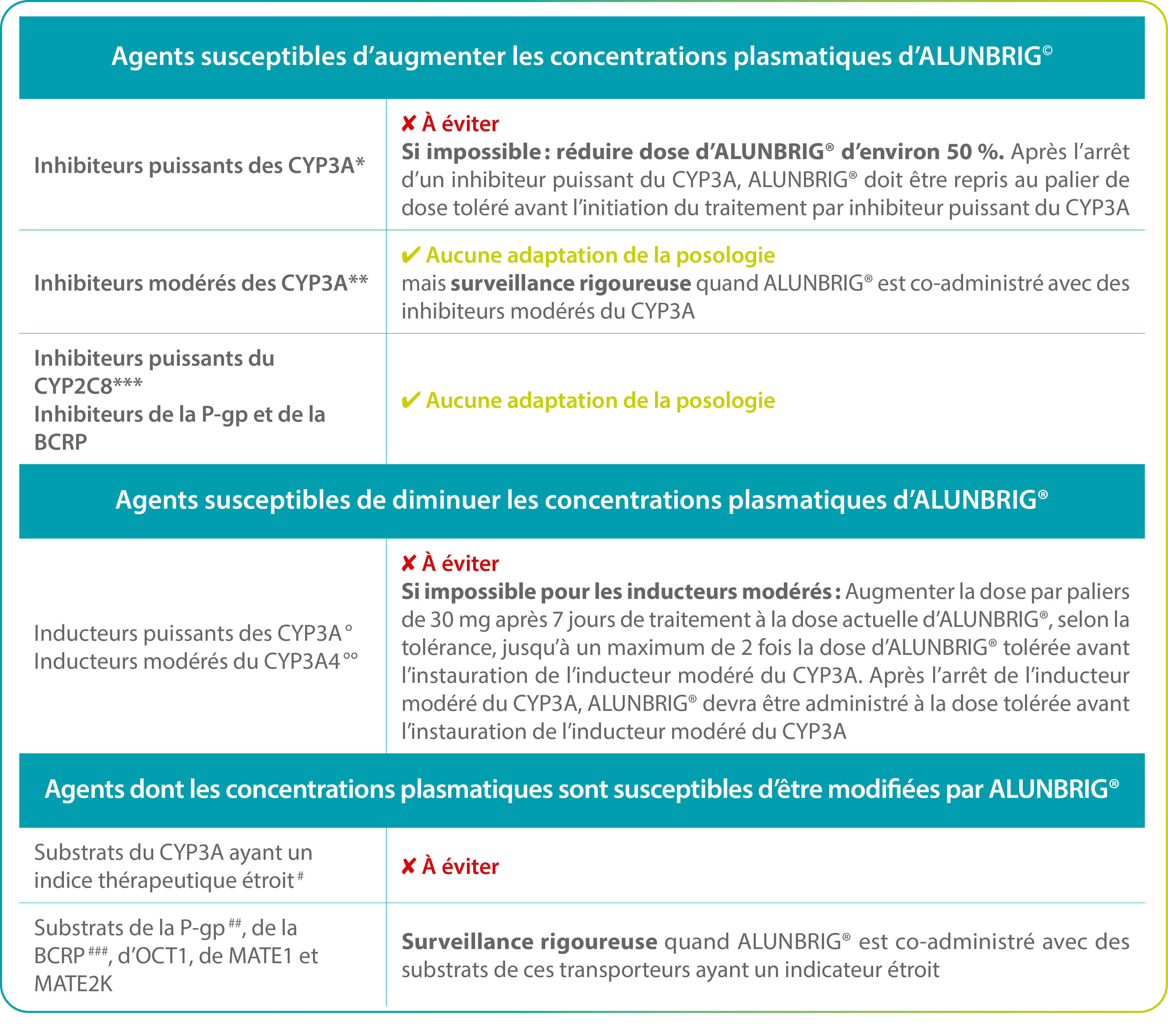 • Selon la sévérité des anomalies biologiques, le traitement par ALUNBRIG® doit être suspendu et la dose modifiée en conséquence