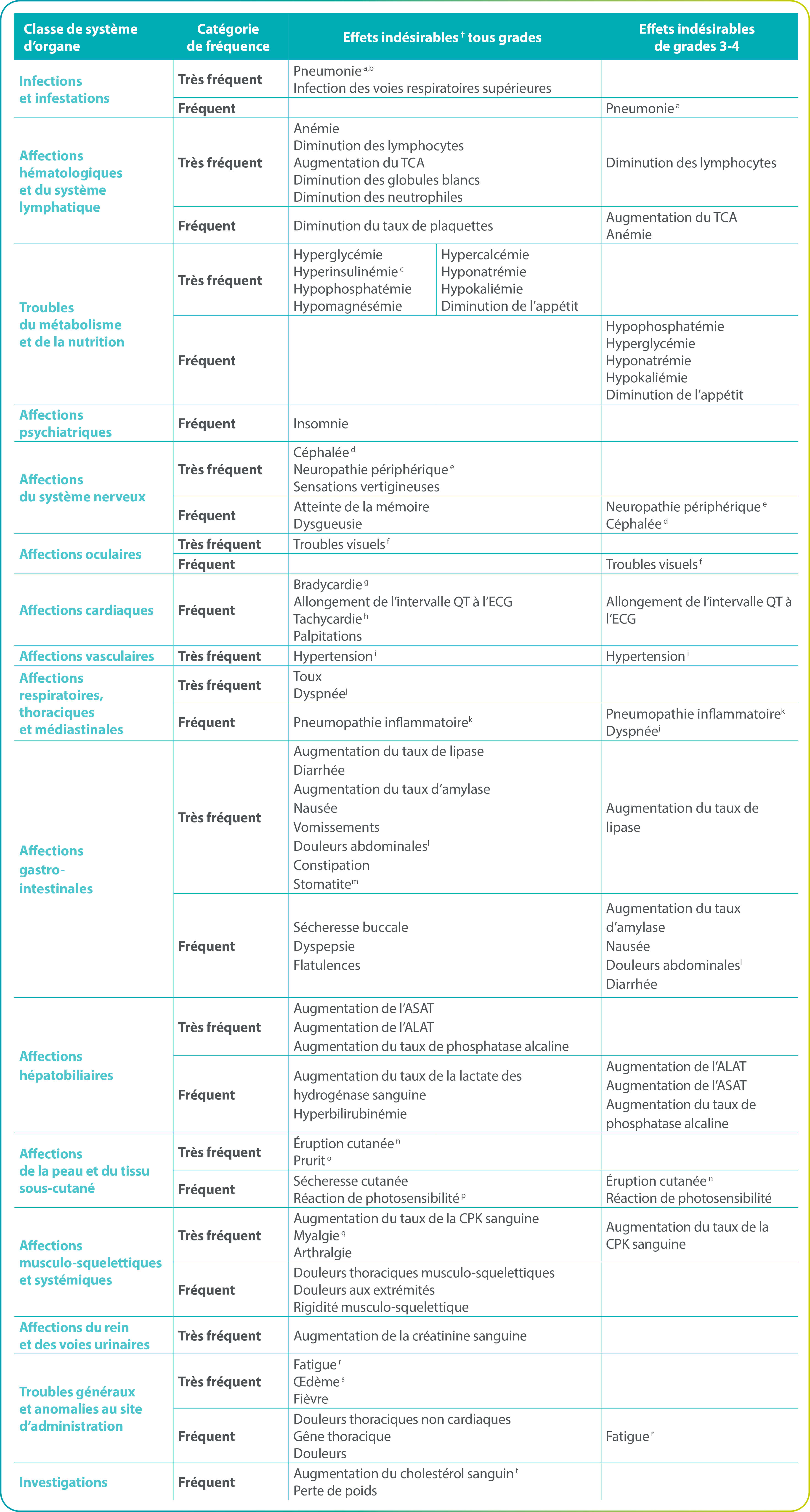 • Les effets indésirables pulmonaires de grades 1-2 ont disparu à l’arrêt du traitement ou après une modification de la posologie.